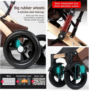 Cadrul este realizat din aluminiu pentru o structură ușoară și rezistentă. Sistemul de pliere compact permite depozitarea și transportul facil. Roțile din cauciuc cu suspensii asigură o deplasare stabilă pe diferite tipuri de teren.