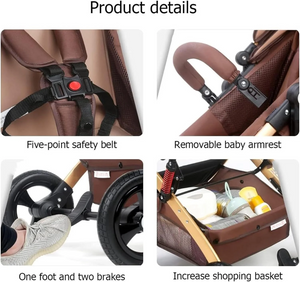 Căruciorul este prevăzut cu centură de siguranță în 5 puncte, frână centralizată și mâner reglabil pentru confortul părinților.